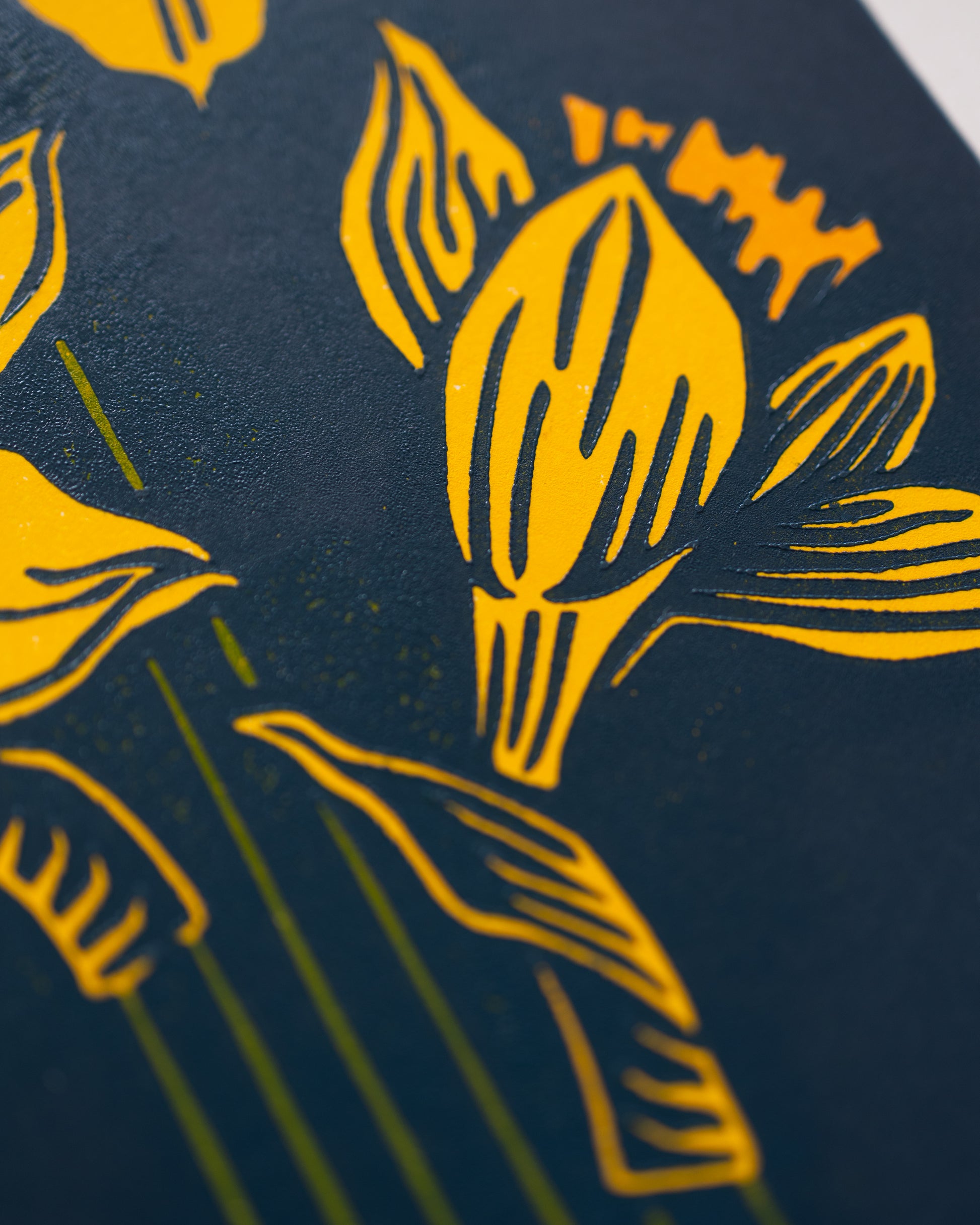 Every print is hand crafted, resulting in unique pieces with slight variations. Ink layers may have a slight shift, and paint density can differ. Purchase only if you accept these natural differences.